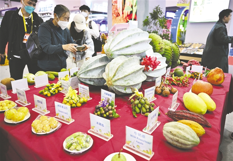 12月15日,观众参观世界热带水果之窗展台展示的热带水果。当日,2022年中国(海南)国际热带农产品冬季交易会在位于海口的海南国际会展中心开幕。本届冬交会展会总面积约7万平方米,设有科技强农馆、乡村振兴馆、国际国内精品馆等10个展馆(区)。来自全国18个省份的1200家企业、2000多个品类参展。展品涉及瓜果蔬菜、粮油、水产、畜牧等。新华社记者 郭程 摄