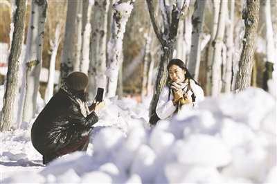 日前,呼和浩特市民在草原丝绸之路文化公园感受冰雪的魅力。每年冬季,首府园林部门都会通过打造人造雪景提升游人的游玩体验。本报记者 王晓博 摄