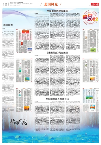 2022年,《北国风光》版所刊发的诗歌作品,秉持和接续了以往追求主流意识和审美意蕴相融的传统,进一步拓展诗歌的视域,在回应时代关切、关照现实生活等方面,都有不同维度的诗意开掘,呈现出令人可喜的局面。除了深度、广度、可读和耐读等诗歌的品质外,还在体现时效性、贴近性,小切口表现大主题等方面,呈现出“风雅颂”的时代新气象。