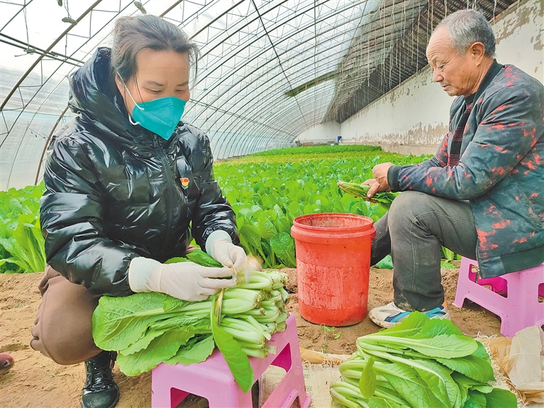 隆冬时节,乌海市海勃湾区千里山镇团结新村温室大棚反季节蔬菜迎来丰收季。图为团结新村党支部党员主动走进大棚,帮助采收、销售蔬菜,增加种植户收入。