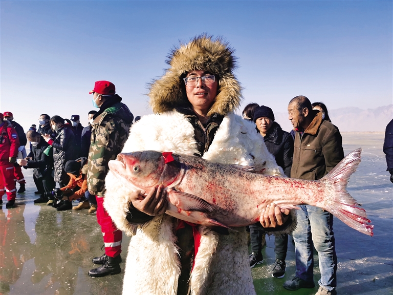 1月9日,在土左旗哈素海首届冬捕节现场,一条条活蹦乱跳的鱼被缓缓拉上冰面,大家争相拍照。当日,“冰雪无限·哈素海有约”2023年土左旗哈素海首届冬捕节暨冰雪旅游季系列活动启动,该活动将一直持续至2月8日。