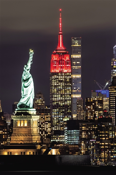 1月20日,美国纽约帝国大厦亮起中国春节主题灯光。随着兔年春节的临近,世界多地以各种方式共同庆祝中国兔年春节的到来。新华社发
