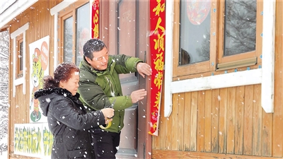 彭成良巡护回来,天上飘起了雪花。夫妻俩一起贴春联、窗花,挂灯笼,冻冰灯。崭新的木屋,红红的灯笼,醒目的春联,五彩的冰灯……被装扮一新的管护站瞬间年味儿十足。为了让春节更有仪式感,二人决定再堆两个雪人。