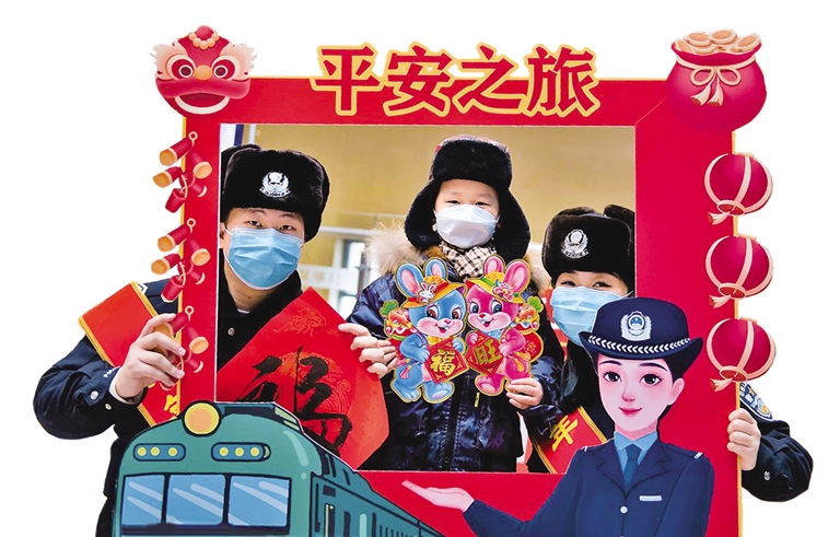 春运期间,海拉尔铁路公安处民警设计了兔年个性手持牌、合影框,同旅客一起合影留念,送上爱心和温暖。