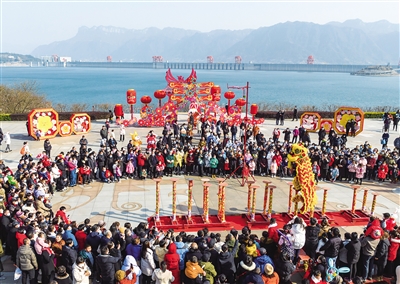 1月24日,民间艺人在三峡大坝前的湖北省宜昌市秭归县屈原故里文化旅游区表演舞狮(无人机照片)。春节期间,各地举行丰富多彩的活动,人们欢天喜地乐迎新春。 新华社发