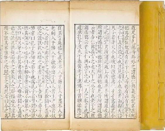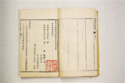现存于辽宁省博物馆的茅坤编《唐宋八大家文钞》初刻本,虽只有其中的第一部分《唐大家韩文公文钞》16卷12册,但它却是一个里程碑的标志,承载着“唐宋八大家”之名确立的重要记忆。全书总序保存完整,书中的《韩文公文钞引》也保存完好。《总序》题款为“万历己卯仲春归安鹿门茅坤撰”“侄茅一桂校刊”。印书纸张采用白棉纸,这种纸张与明代印书使用量较大的竹纸比较,造价更高,更耐保存。书籍的《总叙》《文旨》及各卷《引文》部分采用楷书,目录及正文用的则是宋体字。翻看书页,每页9列,每列19个大字,正文里面经常出现竖排小字,这是编者茅坤的批注,字里行间不时出现长串水滴状墨点,这是茅坤做的标记,是他认为值得借鉴的佳句。