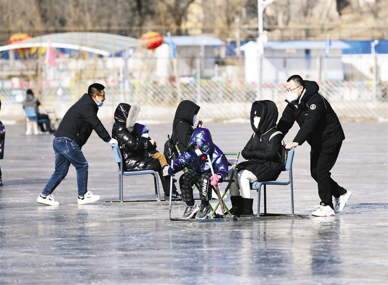 1月25日,游人在青城公园体验冰雪项目。雪上碰碰球、雪圈、冰车等众多冰雪娱乐项目让小朋友和家长大呼过瘾。