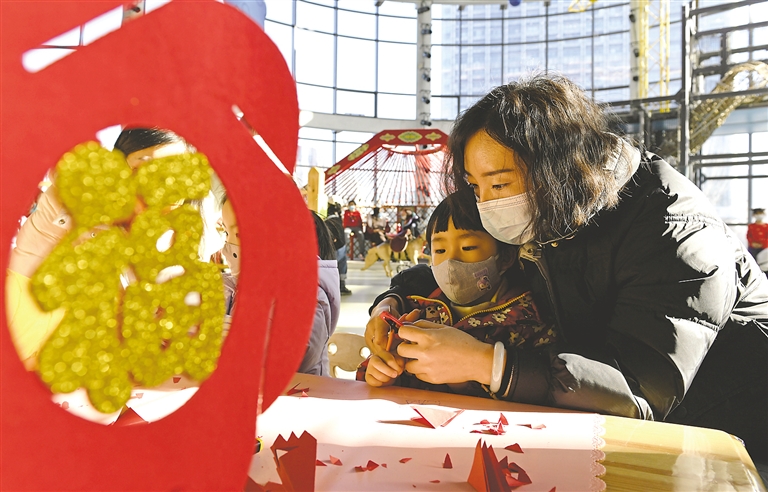 1月27日,呼和浩特市民在老牛儿童探索馆内体验剪纸。春节假期,呼和浩特市老牛儿童探索馆为小朋友准备了年味十足、丰富多彩的年俗活动,孩子们通过参与舞狮、剪纸等新春主题活动,感受中国传统文化的魅力。