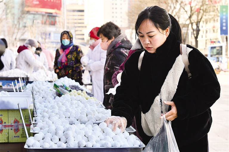 2月1日,在呼和浩特市旧城北门,市民正在购买手工元宵。随着正月十五元宵节的临近,呼和浩特市传统手工元宵零售店迎来销售高峰,各家店铺门前的货架上摆满了五仁、豆沙、榴莲等十多种口味的元宵,供市民挑选。本报记者 孟和朝鲁 摄