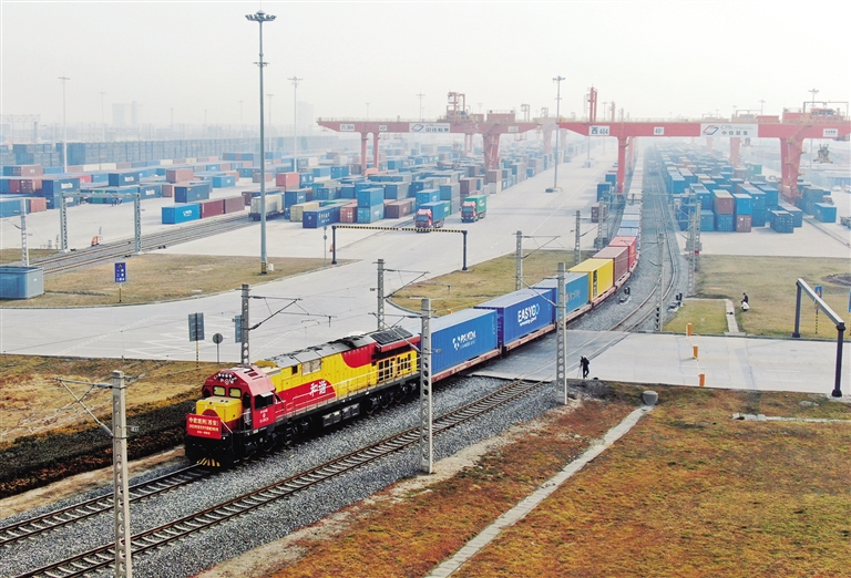 2月1日,X8151次中欧班列从西安国际港站驶出开往明斯克(无人机照片)。当日,满载日用百货的X8151次中欧班列从西安国际港站驶出,开往白俄罗斯首都明斯克。2023年1月,陕西中欧班列开行突破300列,达到346列,创历史同期最好成绩,取得新年开门红。 新华社记者 李一博 摄