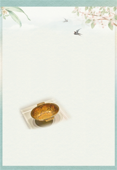 文中是唐代鎏金蔓草鸳鸯纹银羽觞,1970年出土于西安何家村,现藏陕西历史博物馆。银羽觞椭圆形口,双耳如翼,浅腹,锤打成型。器内外满饰鱼子地纹,器底刻宝相花或团花,内壁饰枝蔓流畅、花繁叶茂的忍冬花4株,耳面上各刻小团花一朵。表腹侧錾有莲花座,上立鸳鸯,配忍冬卷草纹,器腹两端各饰振翅鸳鸯一对,亦有莲座。所有花纹皆鎏金。银羽觞采用了钣金、浇铸、焊接、抛光、镀、锤打、刻凿等工艺技术,做工精湛细巧,纹饰既刻画入微,纤巧悦目,又雍容华贵,大方可人。
