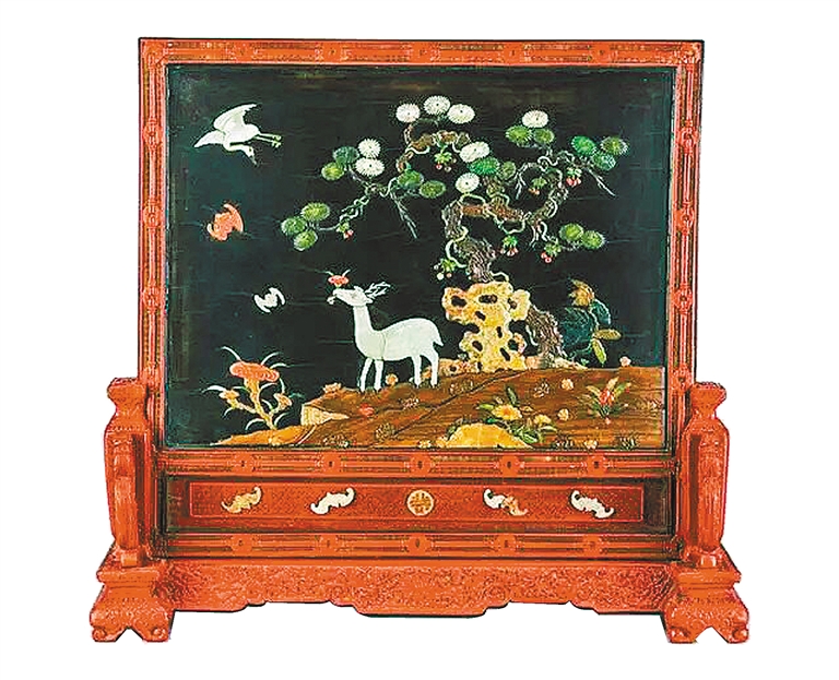 文中这件清代乾隆时期的剔红百宝嵌鹿鹤同春桌屏,现收藏于北京观复博物馆。桌屏是古人搁于桌案之上的陈设欣赏之物。鹿鹤同春桌屏以木为胎,四周髤红漆,上浮雕绳拉玉璧纹,披水牙为西番莲纹。除了剔红工艺,还结合百宝嵌,绦环板以剔红的万字符为锦地,上嵌4只玉雕蝙蝠,中间嵌黄玉镂空“寿”字,有“福寿万代”之意。屏芯木胎,上髤黑漆,以玉、朱砂、砗磲等杂宝组成“鹿鹤同春”图案。鹿衔灵芝立于苍松下,苍松虬曲苍劲,上有仙鹤飞舞,巧妙表达祈愿天下同春之意。桌屏背面用砗磲嵌成60个“福”字,代表一个甲子的福气,满满的祥瑞喜气。