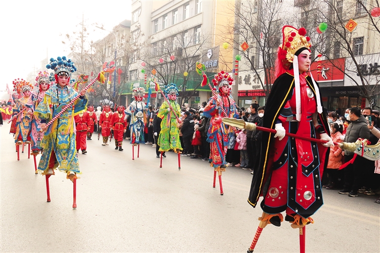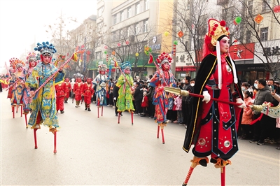| 2月5日,在陕西省陇县,人们在观看高跷社火表演。当日是农历正月十五元宵节,各地开展丰富多彩的闹元宵活动,人们在祥和喜庆的节日氛围中迎接元宵节的到来。 新华社发 |