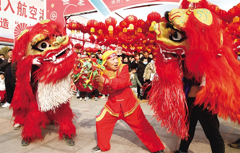 | 二月五日,在河南省开封市尉氏县两湖办事处小西门村,民间艺人在表演舞狮。当日是农历正月十五元宵节,各地开展丰富多彩的闹元宵活动,人们在祥和喜庆的节日氛围中迎接元宵节的到来。 新华社发 |