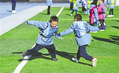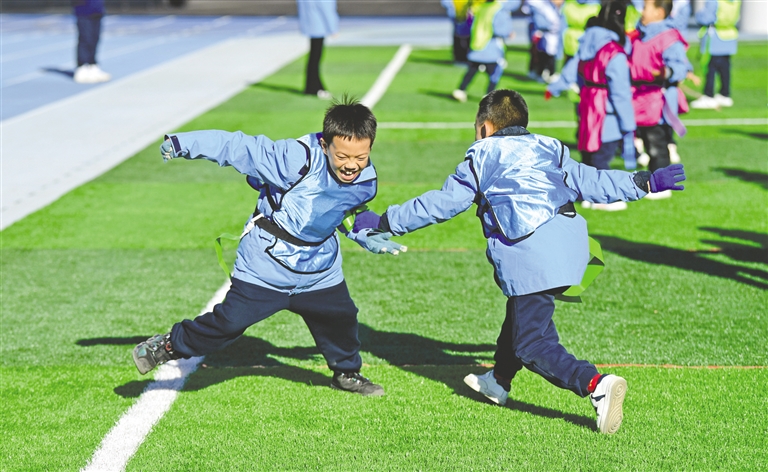 2月6日,呼和浩特市赛罕区万锦学校的学生在“夺旗式足球”运动中快速跑动。为深入贯彻落实“双减”政策要求,着力解决中小学生假期“看护难”问题,该校于1月30日至2月17日组织开展为期三周的免费假期托管服务。本报记者 王磊 摄