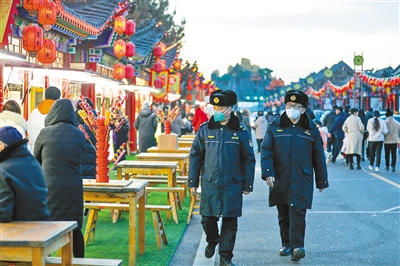 2月4日,呼和浩特市新城区城管队员在恼包村巡查。新春佳节,呼和浩特市大召广场、恼包村等景区举办多场民俗表演活动。连日来,呼和浩特市城管部门加大巡查力度,规范商户经营行为,排查商铺经营安全隐患,为市民创造良好的景区环境。本报记者 马骏驰 摄
