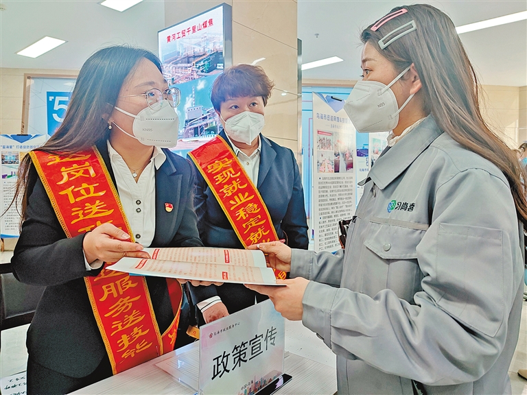 近日,乌海市人社局在乌海市公共就业服务大厅举办2023年春风行动暨就业援助月首场招聘会。图为就业服务中心党支部志愿服务队,在招聘会现场向用工单位和求职者宣传政策、推介就业创业项目。路静 摄