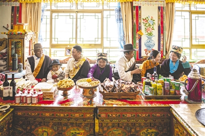 2月20日,在位于西藏拉萨市墨竹工卡县门巴乡的家中,扎西次仁(左一)一家在聊天、享用美食。当日是藏历大年三十,在位于拉萨市墨竹工卡县门巴乡的家中,扎西次仁一家早早起床,开始准备过年所需的各色食品。今年,扎西次仁的儿子丹增赤列肩负购买年货的任务,他提前几天到拉萨八廓商城,买回羊头、人参果等年货。按照当地习俗,一家人要制作各式藏式食品,辞旧迎新。新华社记者 孙非 摄