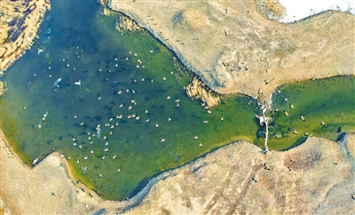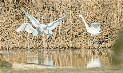 赤麻鸭嬉戏觅食,白鹭曲颈饮水,灰雁飞舞盘旋……栖息越冬的野生鸟类与波光粼粼的水面相映成趣。
