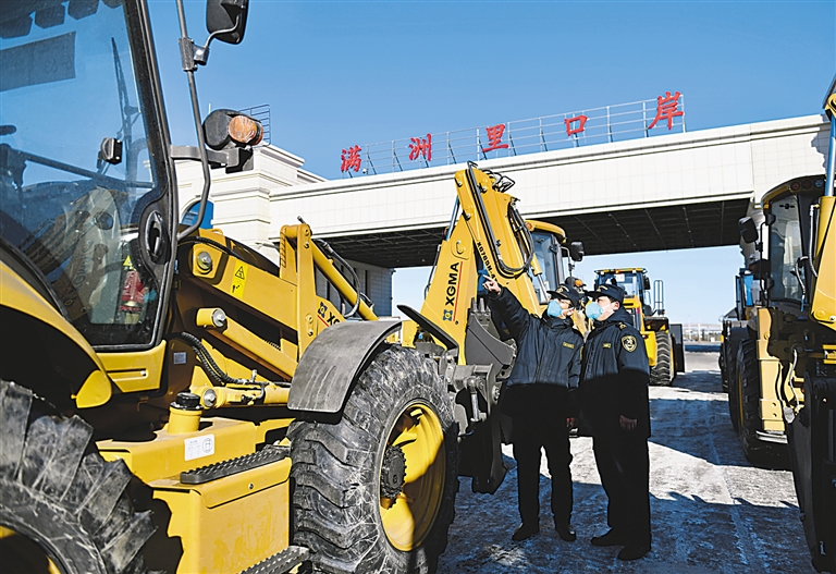 2月26日,满洲里海关所属满洲里十八里海关工作人员正在对出口工程机械车辆进行登临检查。2023年,该海关通过“错时通关”交付、“一单多车”申报、“整提+散提”运输等措施,为国际贸易物流赋能,助力快速通关。今年以来该海关共监管经满洲里公路口岸出口工程机械车辆超过7000台,同比增长近7倍。