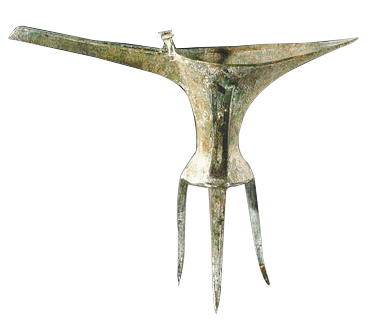 特点:该铜爵1975年在洛阳偃师二里头遗址出土,是迄今为止我国发现最早的青铜爵,被誉为“华夏第一爵”。铜爵窄长流、尖长尾,细腰、瘦腹,扁带状鋬,三棱锥状足。腰腹正面装饰5颗乳钉,夹在两道凸弦纹之间。铜爵造型精巧玲珑,简练朴素,前有长流,后有尖尾,宛若迎风而立、轻盈舒展的窈窕少女,散发着俊俏清逸的气息。