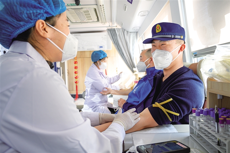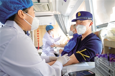 3月3日,消防员正在献血。在第60个学雷锋纪念日来临之际,内蒙古自治区红十字会联合自治区血液中心、自治区消防救援总队开展无偿献血暨造血干细胞捐献志愿登记活动。活动现场,红十字志愿者为消防员讲解捐献知识、发放宣传手册,当日,共有49名消防员及红十字会工作人员参与无偿献血,献血总量达17100ml,共采集造血干细胞血样23人份。本报记者 怀特乌勒斯 摄