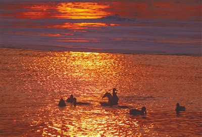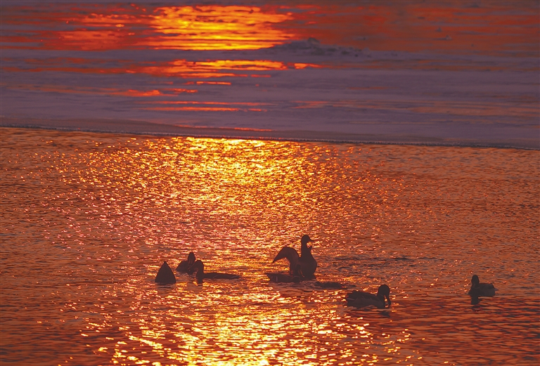 一群绿头鸭在乌兰浩特市洮儿河嬉戏。