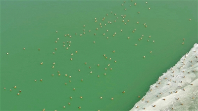 磴口县奈伦湖国家湿地公园,一群赤麻鸭在湖中觅食。