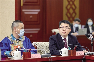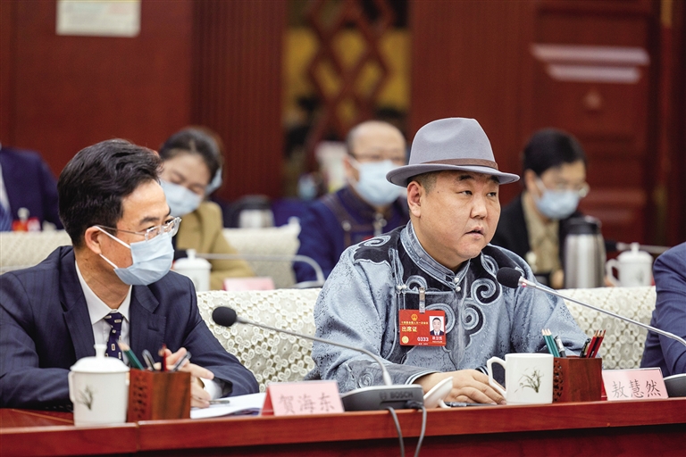 3月5日,全国人大代表敖慧然(右)在审议政府工作报告时建议,多措并举鼓励和吸引更多发达地区优质医疗资源跨区域扩容下沉到基层。本报记者 于涛 摄
