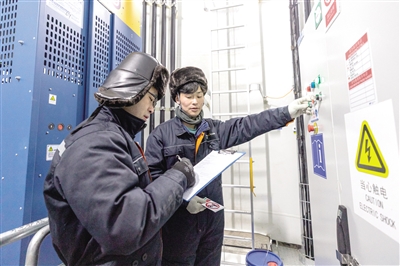 2月12日,位于科右中旗的华能高力板“风光储”一体化治沙100兆瓦光伏发电项目现场,2名工作人员正在一排排光伏矩阵间来回穿梭,认真查看光伏板有没有损坏缺失,排查检修测控柜相关组件是否正常,以确保设备正常运转。