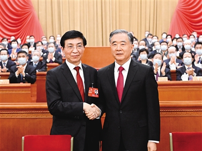 选举结果宣读前,十三届全国政协主席汪洋来到大会会场,对即将产生的新一届政协全国委员会常务委员会表示祝贺。当会议主持人宣布王沪宁当选政协第十四届全国委员会主席后,汪洋起立祝贺,与王沪宁热烈握手,全场响起长时间的掌声。