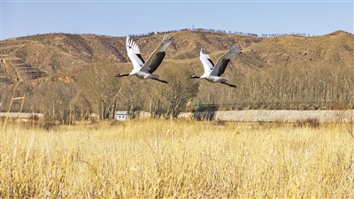 一对丹顶鹤在呼和浩特市石人湾自然保护区翱翔。