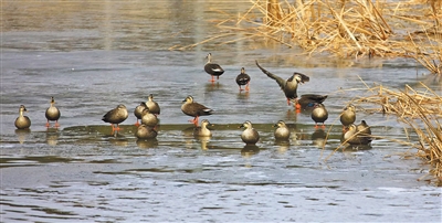 赤峰市锡伯河,一群野鸭子在冰面小憩。文/图 刘千祥