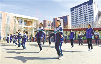 北京四中呼和浩特分校初三年级学生正在大课间练习跳绳,备战中考。日前,呼和浩特市通过随机公开摇号,抽取出一分钟跳绳(男女同项)为2023年呼和浩特市中考学生体质测试选测项目。本报记者 王磊 摄