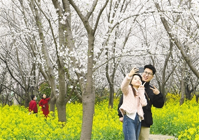 3月19日,游客在唐韵樱花园内合影留念。春到中原,河南省许昌市鄢陵县唐韵樱花园内樱花、玉兰花、油菜花竞相绽放,成了市民踏青赏春的好去处。新华社记者 郝源 摄