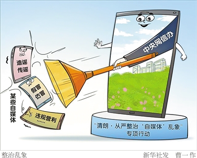 近日起,中央网信办开展为期2个月的“清朗·从严整治‘自媒体’乱象”专项行动,聚焦社交、短视频、网络直播等类型重点平台,坚决打击、从严处置“自媒体”造谣传谣、假冒仿冒、违规营利等突出问题,营造清朗网络空间。新华社发 曹一 作
