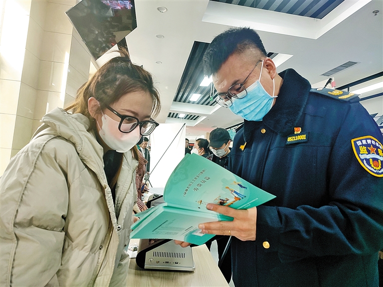 近日,乌海市人社局劳动监察局以“春风行动暨就业援助月”专场招聘会为契机,开展劳动法律法规普法宣传活动。图为乌海市劳动监察局工作人员向用工单位宣传《保障农民工工资支付条例》。路静 摄