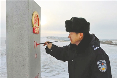 日前,呼伦贝尔边境管理支队新巴尔虎左旗第二边境管理大队民警在执勤巡逻期间,为界碑描红。程坤彭 摄