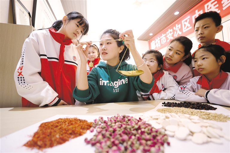 3月24日,在河北省廊坊市第五小学国医馆内,老师在教学生如何为药材称重。近年来,河北省廊坊市各小学积极开设各类丰富多彩的兴趣课。廊坊市第五小学将中医药文化引入校园,通过建设中医药体验馆、开设中医药相关课程,让学生在游戏互动中了解中医药知识,感受中医药文化的魅力。新华社发