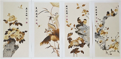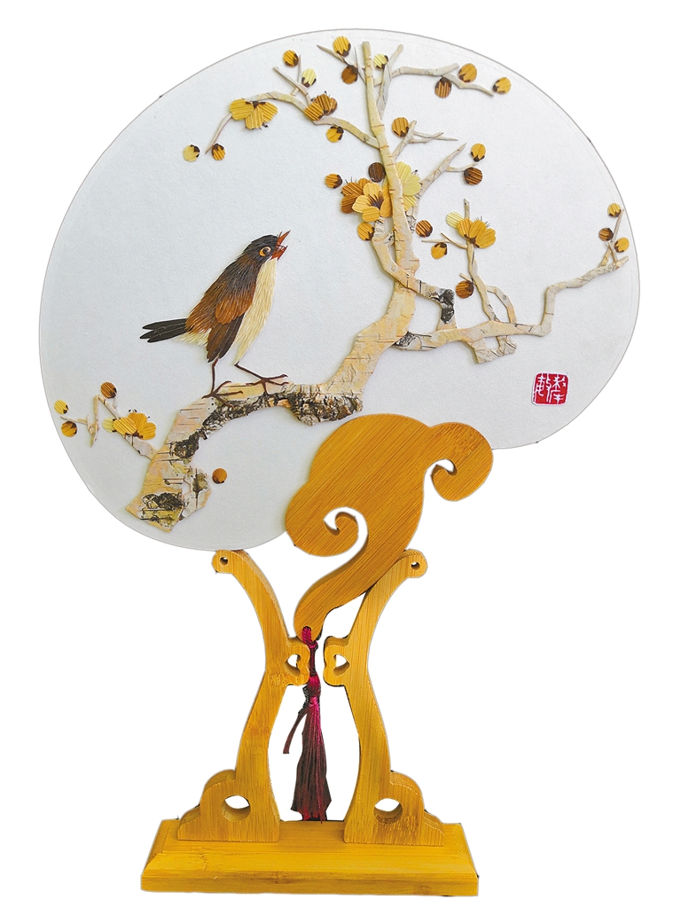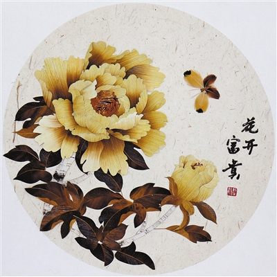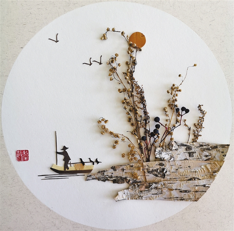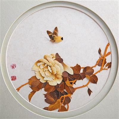 任慧敏说,制作玉米皮粘贴画,主要以玉米皮为主,根据制作内容的不同,还可搭配桦树皮、羽毛、树枝、石子、五谷等天然材料。制作时,根据玉米皮和桦树皮的纹理特点、自然色调,还要经过选材、熨、烫、剪、刻、编、粘贴等多道工序,方可制作完成。