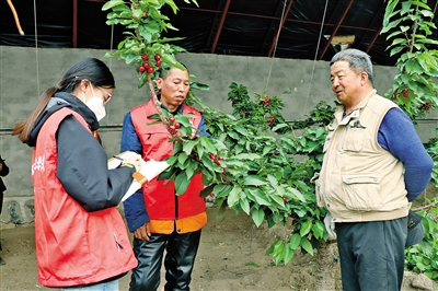 连日来,巴彦淖尔市乌拉特中旗组织党员干部成立助农小分队,深入田间地头,帮助农牧民解决生产难题。图为党员志愿者在海流图镇巴仁宝勒格村樱桃种植大棚内,询问并记录村民在种植、养护和销售过程中存在的困难。 石瑛杰 摄