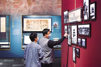 3月28日,观众在观看北京中轴线老照片。3月28日,北京首都博物馆“辉煌中轴”展览开展。展览汇集全国17家文博单位的53组件文物,运用数字化展陈手法和开放式展项,对北京中轴线的壮美秩序、思想源流、历史发展、保护工作等进行系统阐释,展现古都北京中轴线之美。 新华社记者 陈钟昊 摄