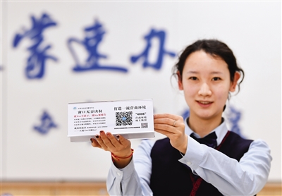 4月4日 ,包头市昆都仑区政务服务大厅工作人员正在展示监督二维码。为优化营商环境,包头市搭建优化营商环境智慧监督平台,运用信息化、大数据手段实行“码上监督马上办”、打造“包你满意”“包你放心”营商环境。本报记者 孟和朝鲁 摄