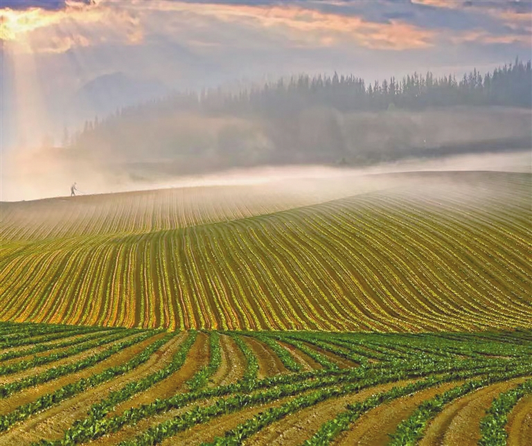画面上,一垄一垄刚冒芽的树苗泛着不同级差的绿色,近景的深绿渐变成中段的淡绿,中段的淡绿又连接着远处的黄绿,就在以“绿”为主题的大地上,摄影家借助透过云雾洒在土地上的光影,构成了波浪起伏的曲线,酷似天籁之声的旋律,又似生命的河流。再仔细看,阔大的土地上竟然有人。这是占画面不到千分之一、正在躬耕陇亩的劳动者。他的侧影几乎融进了阳光,淡淡的、隐隐的、默默的。