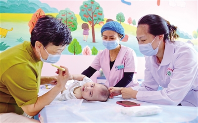 4月7日,呼和浩特市赛罕区金桥开发区社区卫生服务中心保健师为婴儿做推拿。为提升基层卫生服务健康管理能力,更好地为辖区居民提供全面、优质的诊疗服务,该卫生服务中心联合医联体三级医院,积极探索三级医院优质资源下沉基层医疗机构的就医模式,让辖区居民在家门口就能享受到三甲医院的优质诊疗服务。 本报记者 王磊 摄