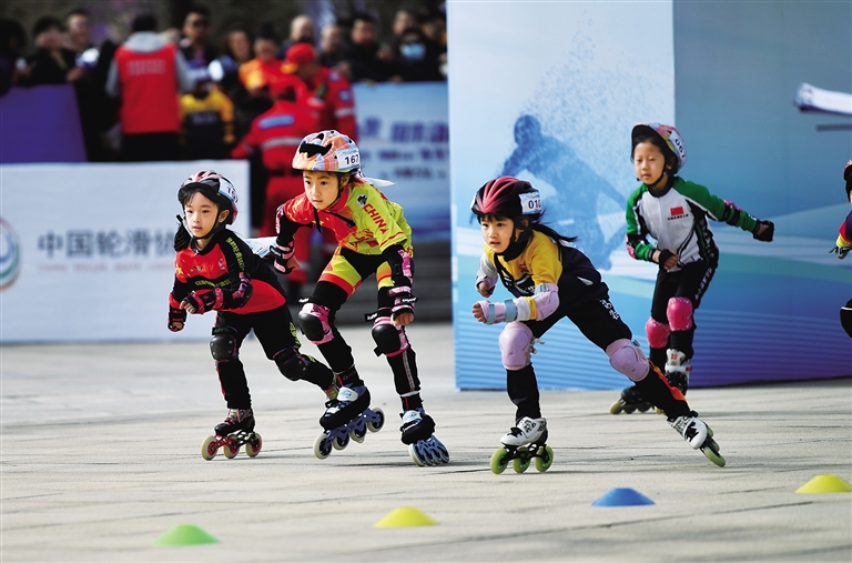4月9日,参赛选手正在进行100米速滑比赛。当日,“健康正出发周末动起来”2022-2023赛季“滑启100”速度轮滑系列赛在呼和浩特市滨河体育公园举行,来自呼和浩特市、包头市、鄂尔多斯市、乌海市、乌兰察布市、锡林郭勒盟等盟市的23支代表队300余名运动员参加了比赛。本报记者 孟和朝鲁 摄