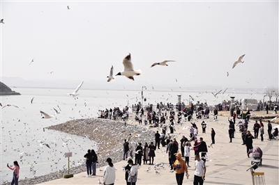 眼下春暖花开,万物复苏。在乌海湖一号码头,寂静了一冬天的乌海湖因红嘴鸥的到来而热闹了起来,它们在宽阔湖面上或展翅翱翔或浮动嬉戏或引吭高歌,不少市民游客纷纷拿出手机,捕捉它们矫健的身姿。还有不少市民游客在岸边与其亲密互动,构成了一幅灵动的图画。