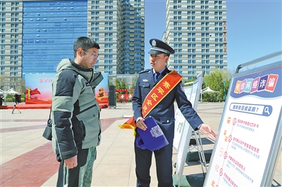 为进一步提升辖区群众的防范电信网络诈骗意识,筑牢反诈防线,4月7日,为期一年的呼和浩特市赛罕区全民反诈宣传活动启动。当日,赛罕区16个派出所及辖区7个中国银行营业网点同步启动反诈宣传活动。图为民警正在讲解反诈知识。本报记者 陈春艳 见习记者 李佳雨 摄