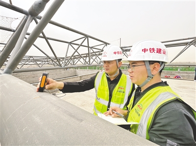 4月12日,包银高铁乌海海勃湾站站房工程施工人员进行钢结构检测。当日,包银高铁全线最大新建站乌海海勃湾站主体工程全面完工。有着“包银第一站”之称的新建乌海海勃湾站站房建筑面积10000平方米,站场为4台11线,可同时容纳1200名旅客候车。 本报记者 马骏驰 摄