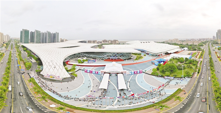 4月14日,观众有序排队进场(无人机照片)。当日,第三届中国国际消费品博览会迎来社会公众开放日,吸引观众前来观看展览、选购商品。